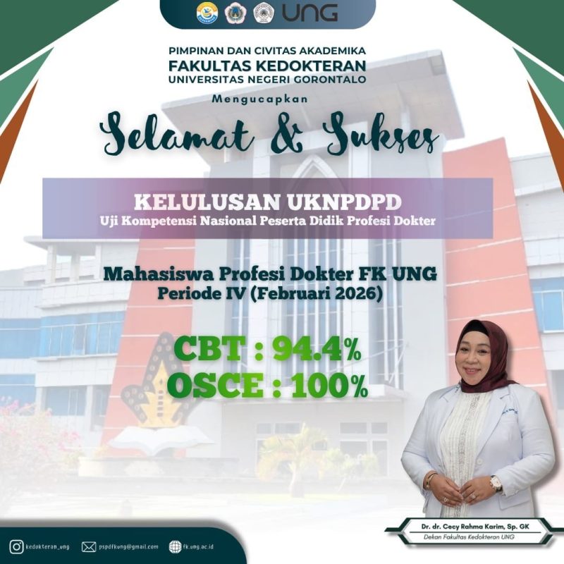 UKNPDPD merupakan tahapan penting yang harus dilalui mahasiswa profesi dokter sebagai standar nasional, sebelum memasuki dunia praktik kedokteran. Capaian ini sekaligus memperkuat posisi FK UNG sebagai institusi pendidikan kedokteran, yang berkomitmen menghasilkan tenaga medis profesional dan berdaya saing.